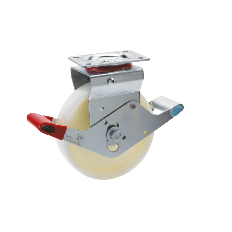 - 4 roți nealiniate cu frână, pivotante, Ø125 mm din nylon acoperite cu poliuretan expandat cu dispozitiv de frânare cu dublu pedala