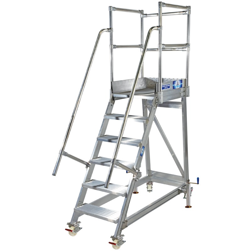 Scară mobilă de podium complet demontabilă pentru utilizare profesională, ideală în întreținerea industrială, extrem de versatilă, având posibilitatea de a avea ieșire frontală, laterală dreaptă/stângă.