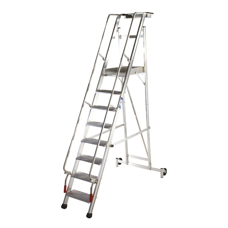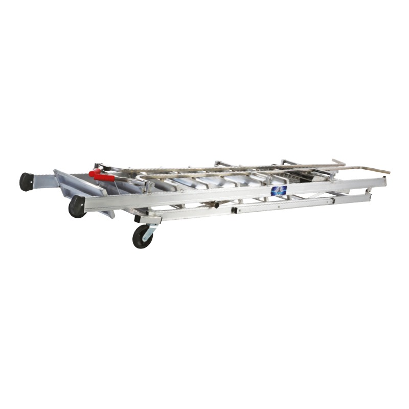 Scară din aluminiu pliabilă cu o dimensiune redusă pentru transport și depozitare.